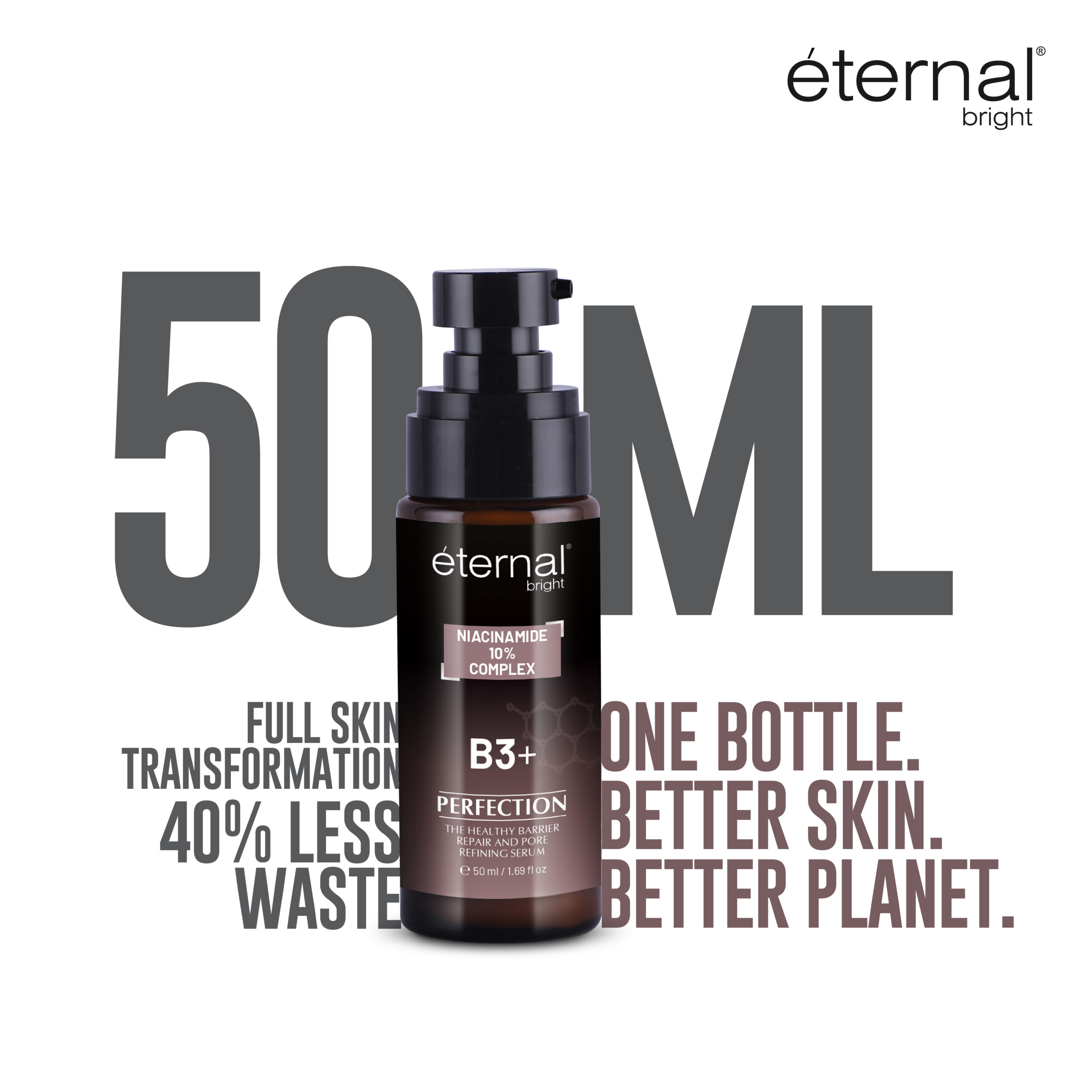 Enlarged pores, oily skin, pigmentation, and dullness can make skin appear uneven. Eternal Bright Niacinamide Serum is specifically designed with 10% Niacinamide combined with Zinc PCA to regulate oil, tighten pores, and brighten skin.